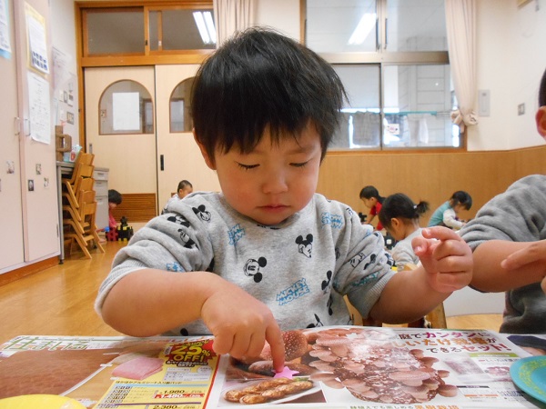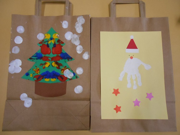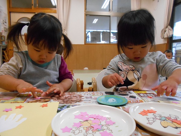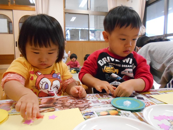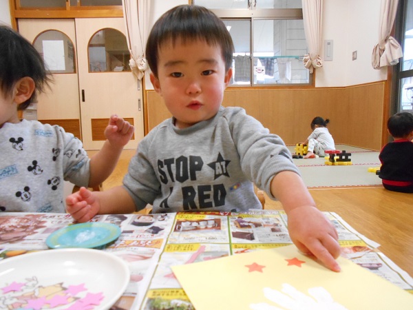 1の指でのりをつけ、サンタさんの周りに星を貼りましたよ。