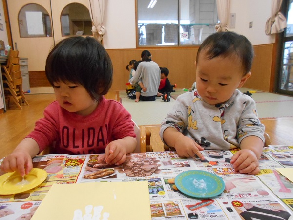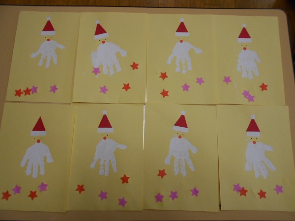 先日、手に絵の具をつけて取った手形が、サンタさんに変身♡