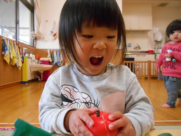リンゴもおいしそう♡と大きなお口を開けて、パクっと食べるまねをしていましたよ♡