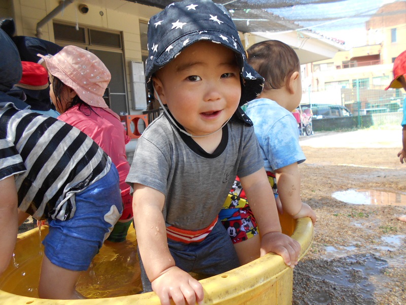 器に水を入れ、タライの外にジャーっと流し、水たまりができるくらい繰り返し楽しんでいましたよ♡