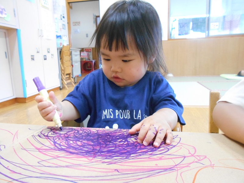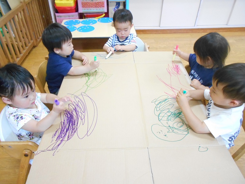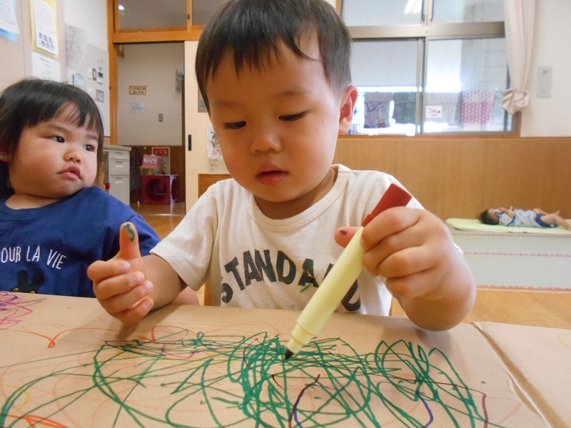 自分の好きな色のマーカーを選んで、段ボールにじろじろ~!!