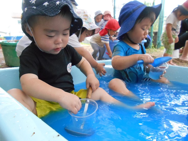 お玉やスコップで色水をすくって、どっちが早くいっぱいになるかな(笑)