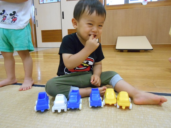 車をたくさん並べて、「い~、に~...」と数を数えたり...
