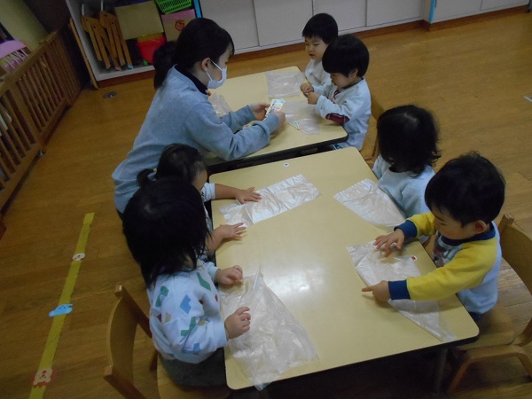 ビニール袋を裏、表とひっくり返しながら好きな場所にシールを貼りましたよ♪