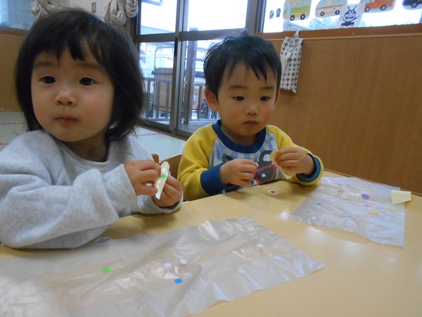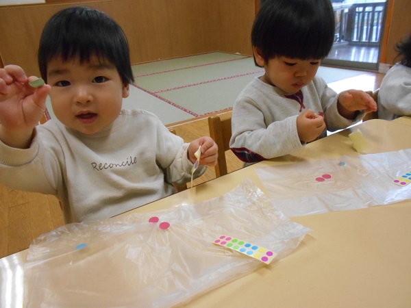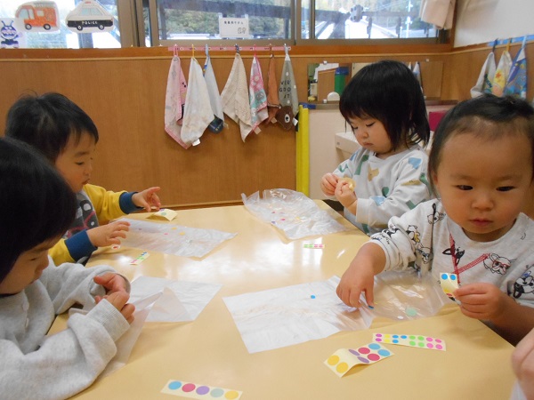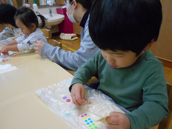 うさぎ組さんはシール貼りが得意です✨大きさの違うシールでも指先を使って上手に貼っていきます!