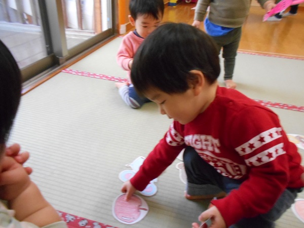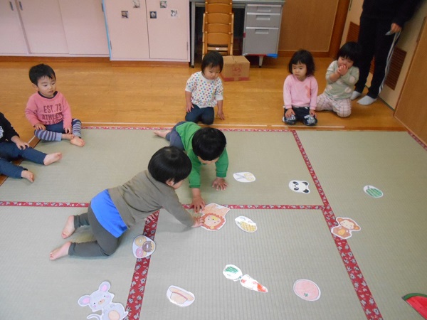 帰園してからはカルタをしました。「ライオン」と言うとライオンを見つけてすぐに取りに行くお友だち✨