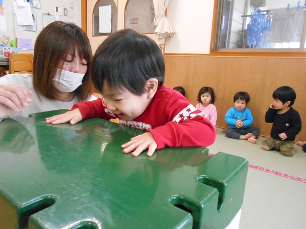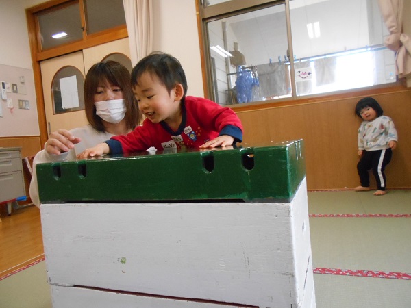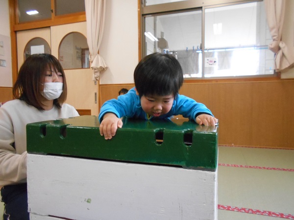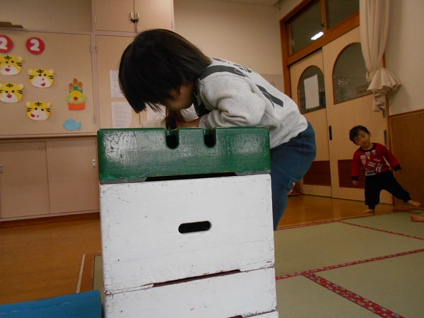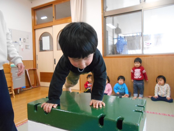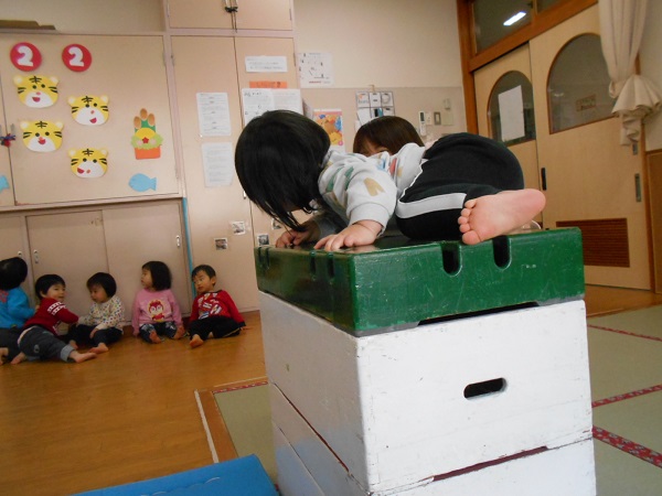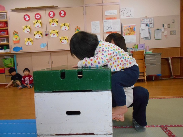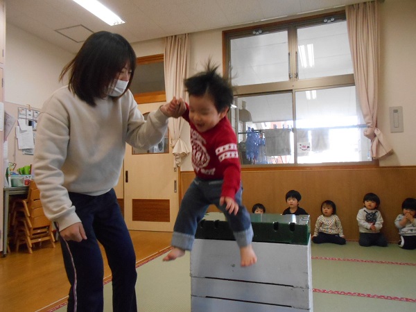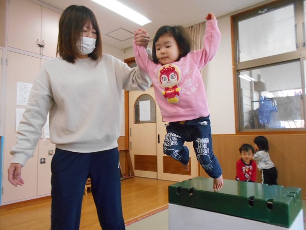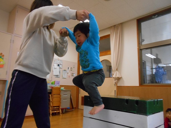巧技台に上ると保育者と一緒にジャーンプ!!