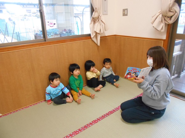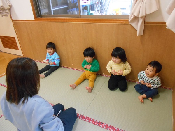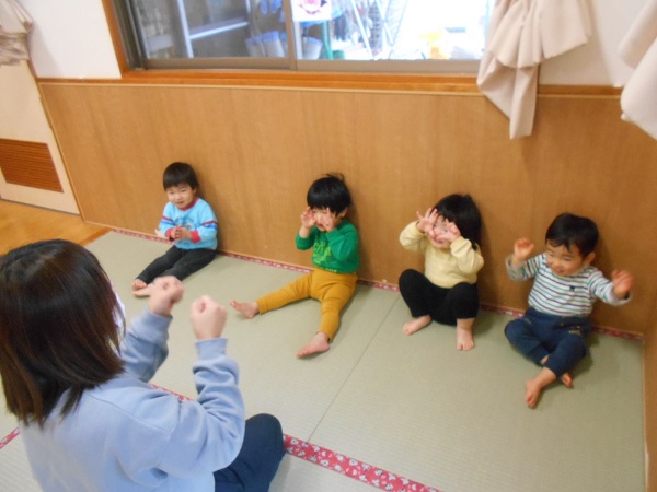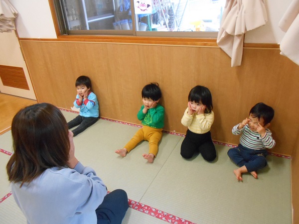 活動の前に「トントントントンひげじいさん♪」の手遊びをしました。