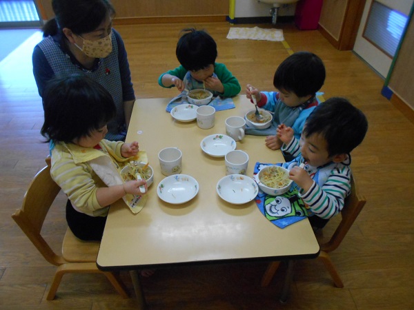 みんなの大好きな給食の時間です☆今日のメニューは「ちゃんぽん麺」だったので、ちゅるちゅる~と美味しそうに食べ、あっという間に完食したうさぎ組さんでした✨