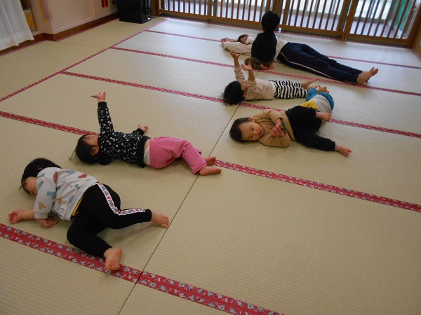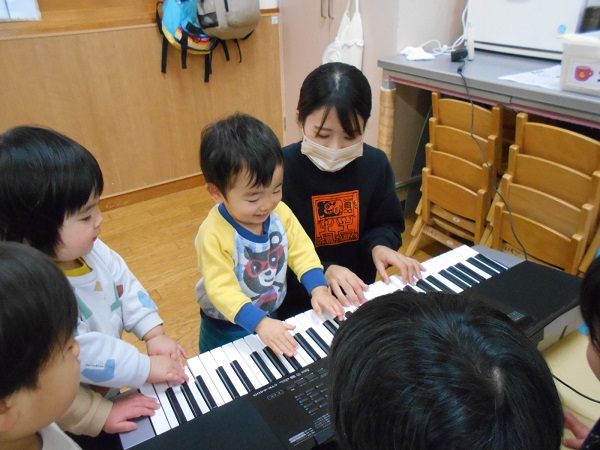 2022年01月21日 まったり・・・今日はりんご組さんとお部屋で過ごしました。寒いのでリズムをして身体を動かしました。保育者の真似っこが上手です!畳の上でごろごろ~気持ちがいいね■リズムで保育者がピアノを弾いているとピアノが気になったうさぎ組さん■特別に触らせてもらいました!■まわりに集まり、「かえるのうた」を歌いました■気分はもうピアニスト!楽しかったね■来週も元気に過ごしていきたいと思います。