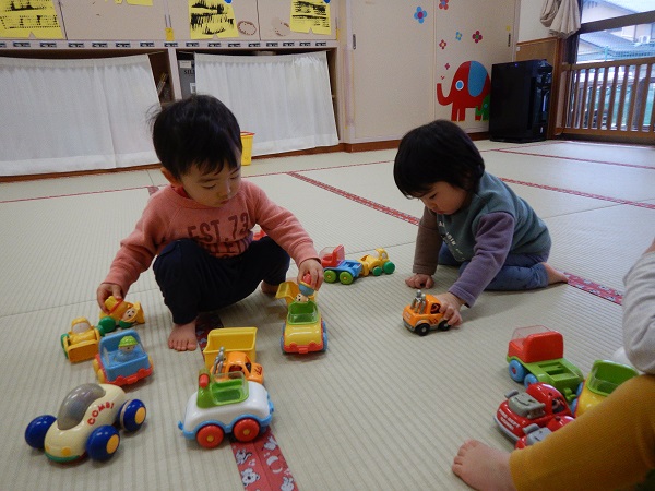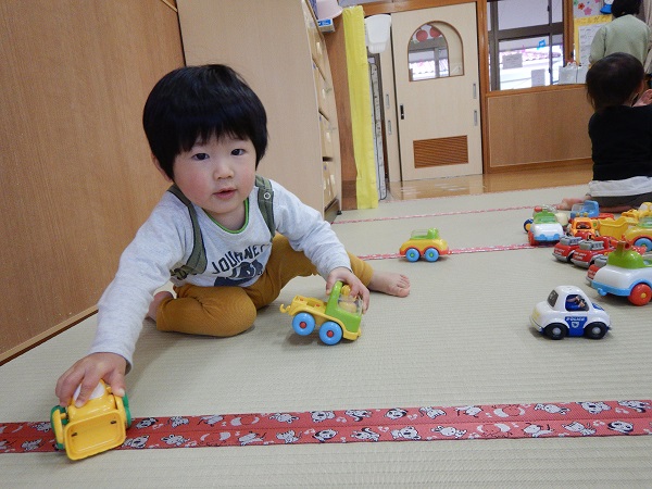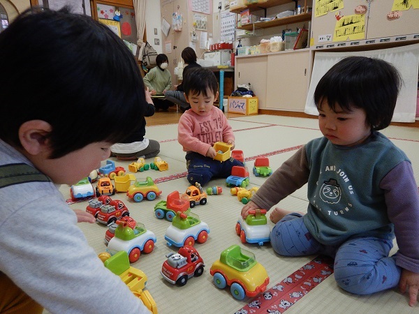 2022年01月26日 楽しいな♪今日は車の玩具で遊びました♪たくさんの車の玩具に囲まれて、嬉しそうでしたよ■「ブッブー■」長い時間、保育者やお友だちとお喋りを楽しみながら、集中して遊んでいましたよ!大好きな玩具でたくさん遊べてよかったね♡