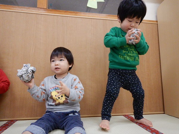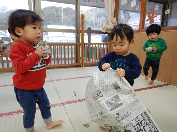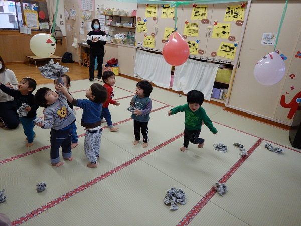 2022年01月31日 鬼退治!!りんご・うさぎ組と一緒に新聞紙遊びをしました!まずは新聞を丸めて、ボールを作ります♪ぐしゃぐしゃ~、ぎゅっぎゅっと力を込めて・・・。すると、風船になった鬼が出現!?みんなで作ったボールを鬼に当てます。鬼退治だー!■それっ!しっかりとボールを鬼に当てることができましたよ✨室内でも身体を動かして遊ぶことができました。今週はどんな楽しいことが待っているかな?