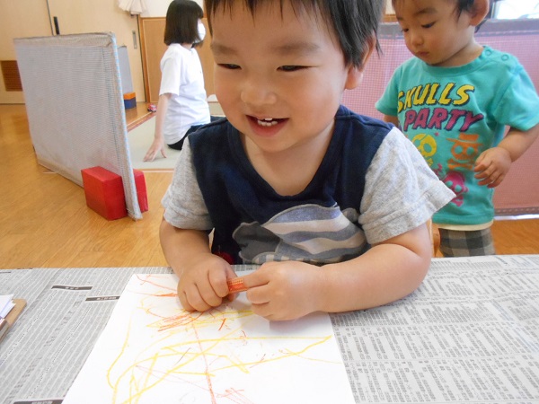 初めは筆圧が薄かったり、ちょんちょんと点を描いたりする子もいましたが、少しずつクレヨンを力強く握れるようになり、ぐるぐると円を描いたり、線を描いたりすることができるようになりましたよ✨