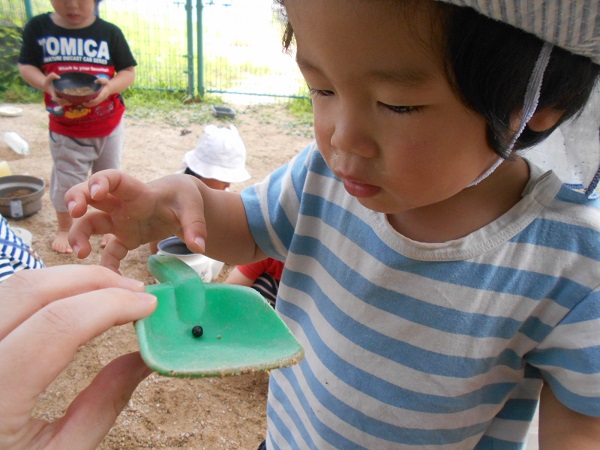 保育者に砂で型抜きををしてもらうと、「どうして?」「すごい!」と不思議な顔をしてみたり、ニコッと笑って楽しそうにしてみたりといろいろな表情を見せてくれました☆