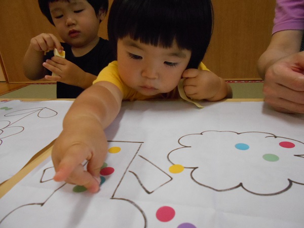 シール貼りは、少しずつ指先を器用に使えるようになってきて、保育者の手を借りず、台紙からシールを剥がすと親指、人差し指を使い貼ることができるようになりました✨