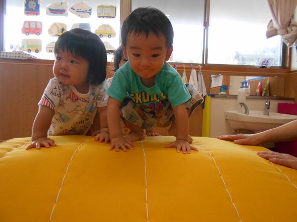 2021年08月18日 よいしょ、よいしょ!!マット遊びをしました!巧技台を下に置き、その上からマットを掛けてお山を作りました。早速登ってみます♪上まで登ると、お尻をつけて滑っていきます。すべり台のように「ビューン」と言いながら楽しそうに滑っていましたよ■ごろごろ寝転がってマットの感触を楽しんでみたり、手足の力を使ってのびのびと全身を動かすことを楽しんだりしながら遊びました☆遊戯室に移動し、すべり台でも遊びましたよ♪楽しかったね■