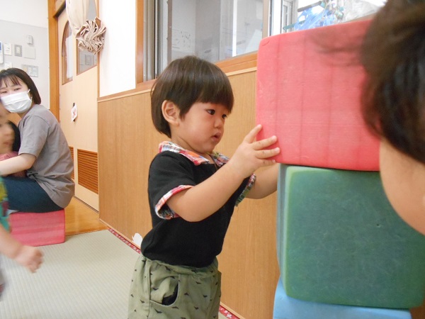 ボールを片付けた後は、プラフォーミングを積み重ねたり、車のようにまたがったりして遊びましたよ☆