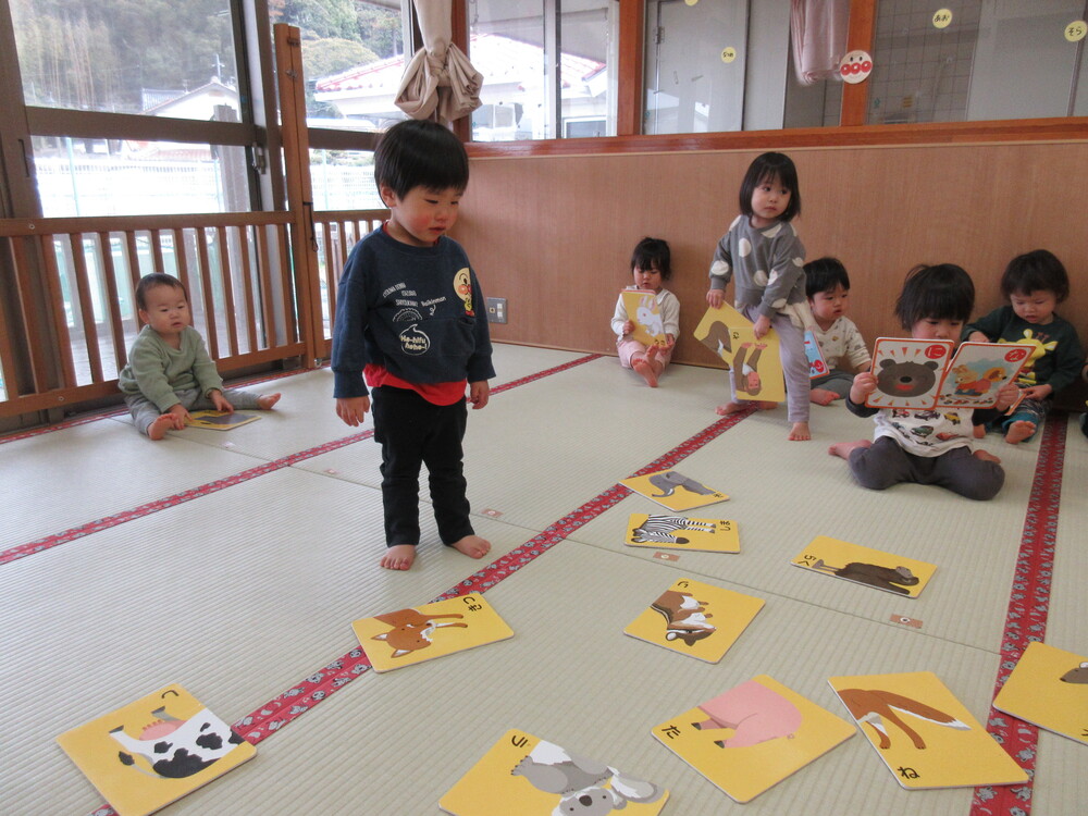 動物たち♪ 2023年02月21日 りんご組さんと一緒に絵合わせかるたをして遊びました。 『ぶた』『ぞう』などお題を聞いて、どこにあるのかよく見て探します! 顔と体が合っているかな? みーつけた! 見つけた動物をみんなに見せてくれました! うさぎ組さんのうさぎだね♡ 様々な動物を見つけることができて嬉しそうな子どもたちでした!