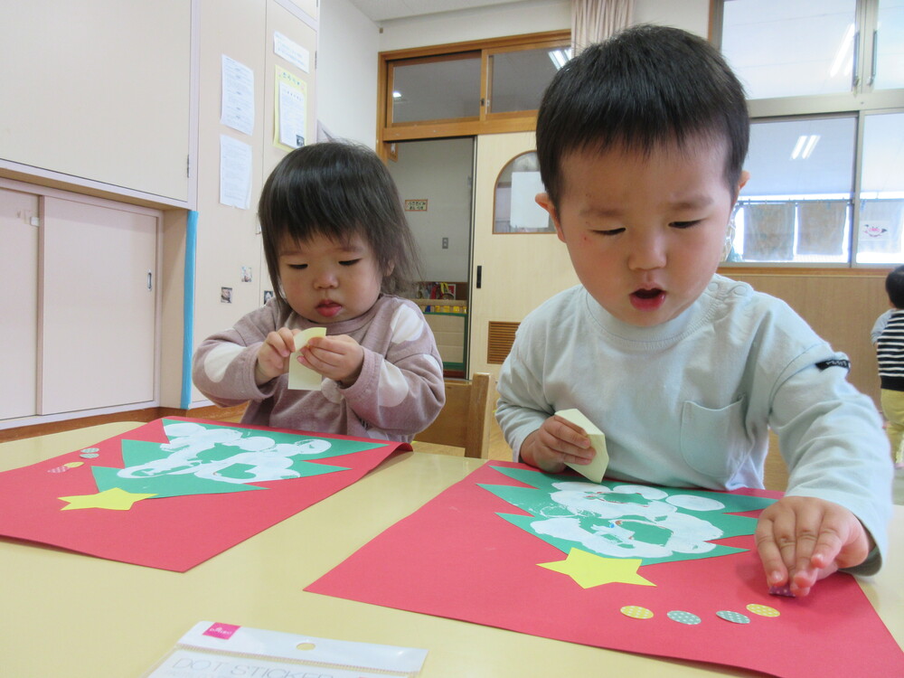 前回作ったツリーを台紙に貼り、ツリーの周りにみんなの大好きなシールを貼りましたよ♡