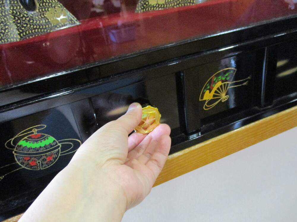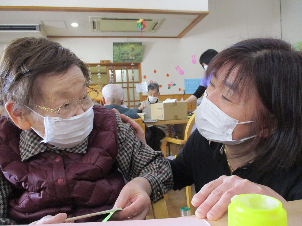 おひなさま♪ 2023年03月02日 今年も玄関でおひなさまが皆さんを迎えてくれています☆ このつまみを回すと・・・ ♪あかりをつけましょ ぼんぼりに~♪ と、オルゴールが流れます(^^)/ Hさんと一緒にひなまつりのお話をしながら眺めていました。 今日からご利用のTさんは手芸がお得意です☆パンジーの飾りを丁寧に貼ってくださいました!! これからもよろしくお願いします☆