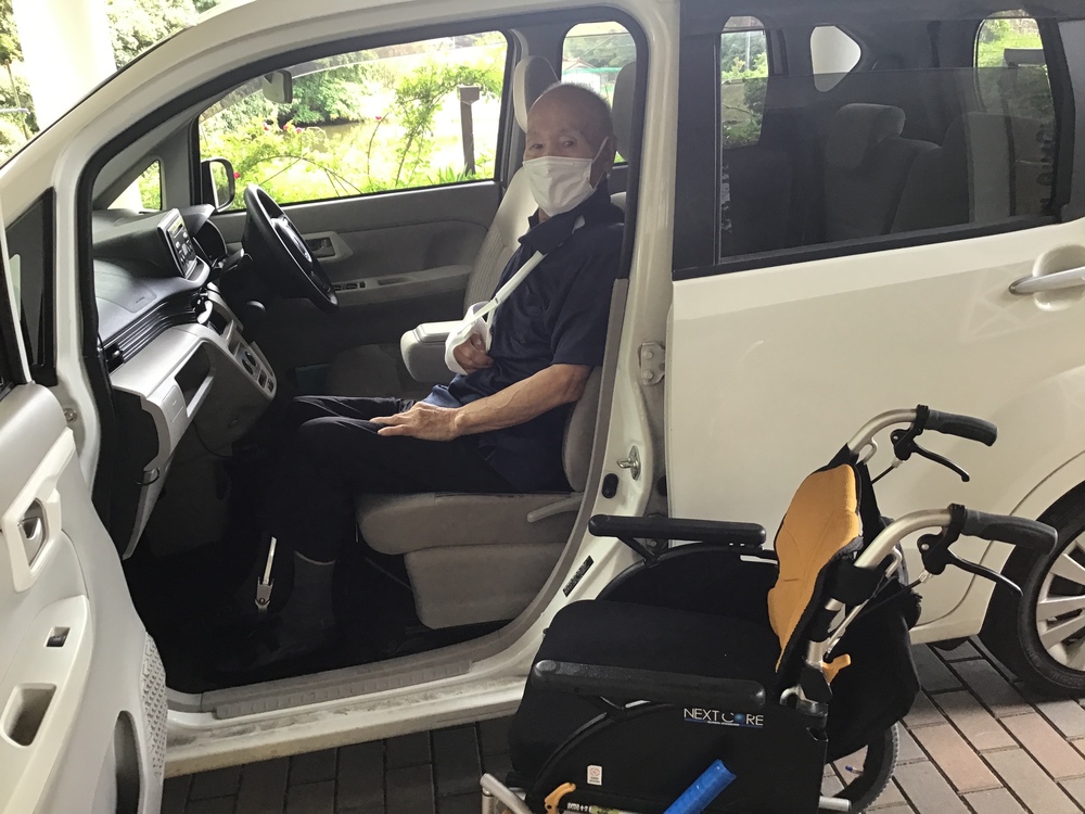本日2回目の利用のI様。外出時の車の乗降や自宅でのベッド移乗動作の評価を実施し、動作指導を行っています。