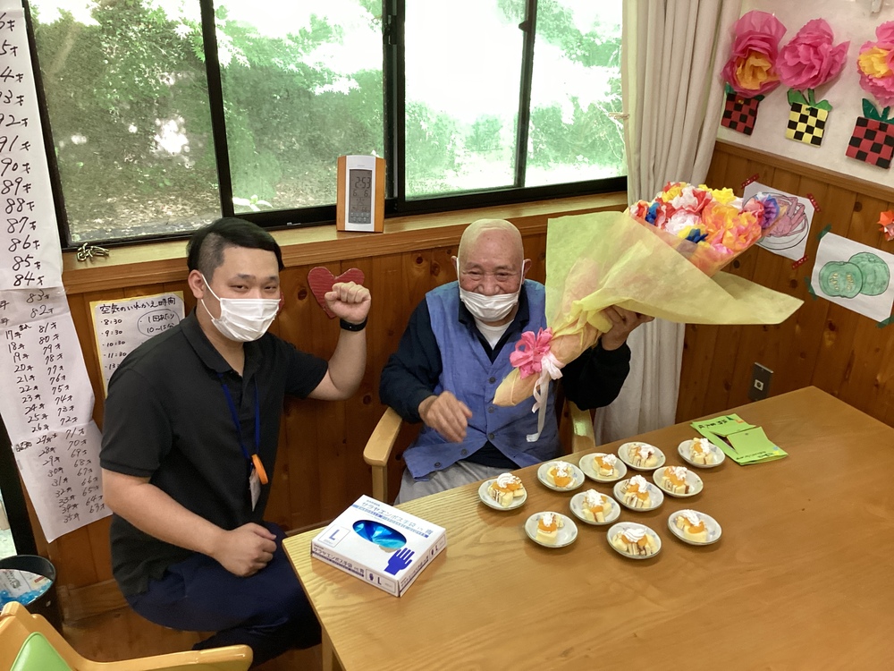 その後は、利用者様と一緒に「ハッピーバースデイ」を歌ってお祝いしました。花束とメッセージカードをお渡しし、ニッコリ笑顔で喜んでくれました。スタッフ一同すごく嬉しかったです!!