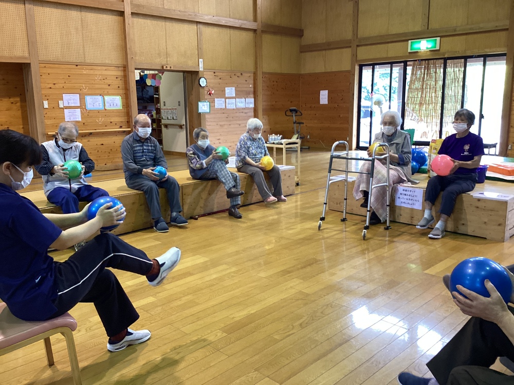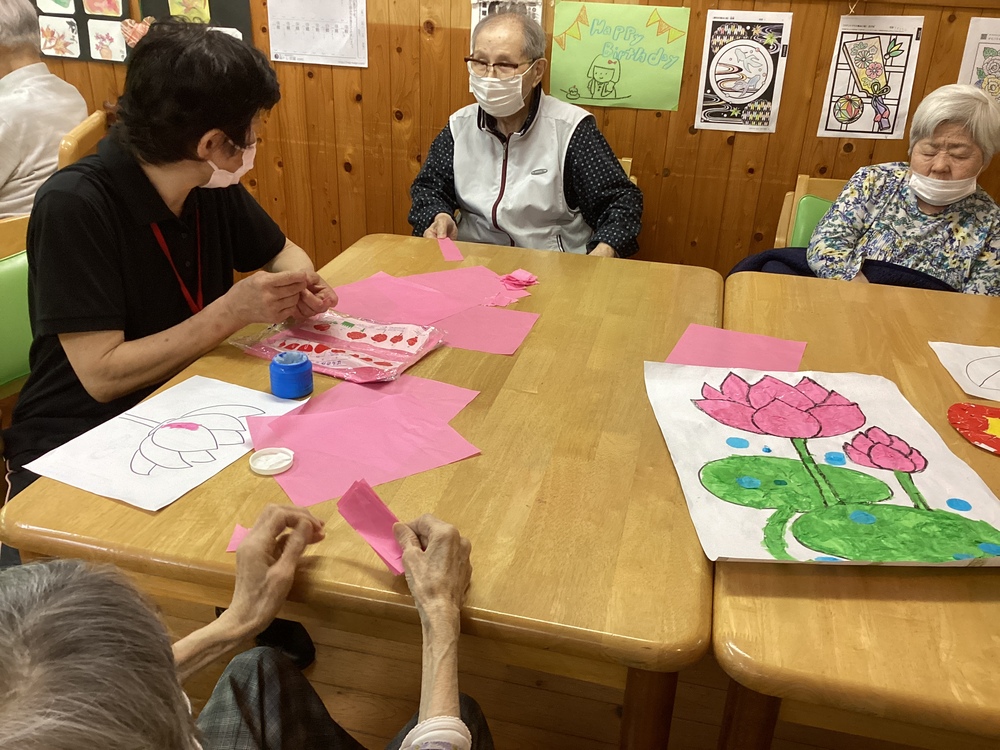 それぞれに合わせて 2023年06月23日 今日は生憎の曇り空。むしむしと暑い日でしたが、皆で体操を頑張りました ビラあさやまでは大小、空気圧様々のボールを使用しておりそれぞれの難易度で実施しています。 例えば片麻痺などで握力が低下している方は小さく空気圧が低い方が把持しやすく行いやすいです。 ボール1つあればどこでもできるため、ぜひ皆さんもやってみて下さい。 7月の飾りつけに向け蓮の花を作成中です。 利用者それぞれちぎる人、貼る人と役割を決め行っています。 完成をお楽しみに。