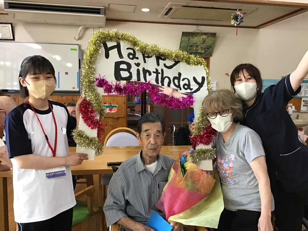 職場体験 2023年07月27日 大田高校の生徒さんが職場体験に来られました! 利用者様とたくさんお話しをしたり、一緒に体操、手作業をしてもらい、介護の現場を体験して頂きました。 誕生日会をしました。 奥様と一緒に記念撮影しました!!