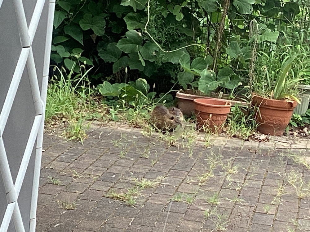 昼食後、花壇を見るとヌートリアが。草花を食べている様子を皆で観察しました。