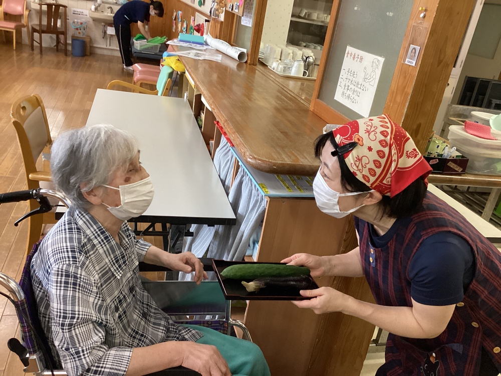 おいしく作ってね!(憩い) 2023年07月31日 収穫! 今月からご利用のTさんにあさやまファームの 野菜の収穫を手伝って頂きました! 採った野菜は調理員に渡し、 「おいしく作って下さいね」と料理を楽しみにしておられました! 頑張ります! 体操やリハビリも頑張っています! 「毎日頑張るよ!」と張り切っておられます!
