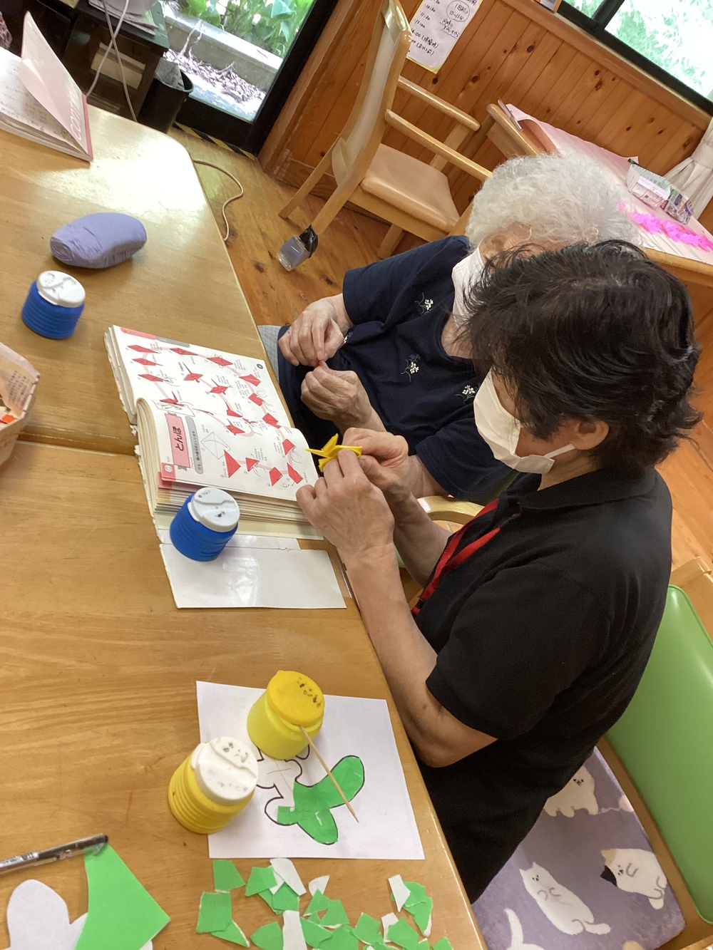 ついに完成(憩い) 2023年08月02日 梅ジュース! 約1ヶ月前に漬けた梅ジュースが完成しました! 毎日ビンを回して混ぜて頂いたため おいしい梅ジュースが出来上がりました! 梅が好きな利用者様がほとんどで 「これはおいしいね~」と皆さん 笑顔で飲んでおられました! ひまわり完成! 手芸作品のひまわりが完成しました! 皆さんの努力のおかげで大ひまわりと小ひまわりが 見事完成しました! そして、9月から開催されるパネル展へ向けても 手芸作品作りを開始しています! 皆さん頑張りましょう!