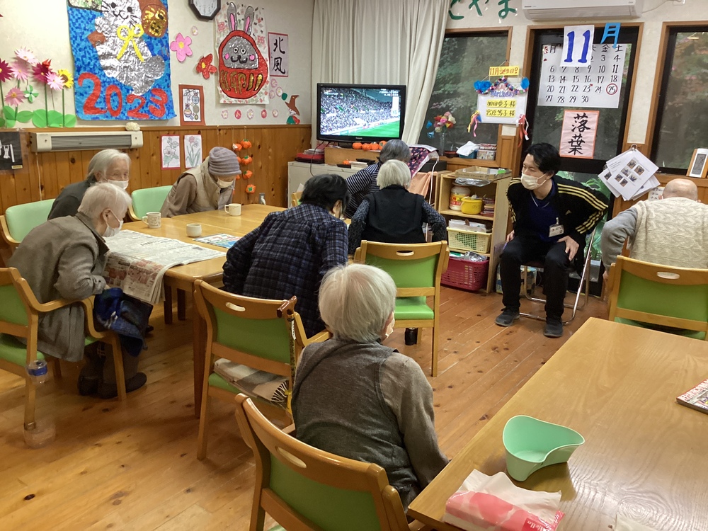 お茶の会(憩い) 2023年11月25日 本日は喫茶の日、利用者さんにお茶をたててもらいました。 あまりの美味しさに笑顔がこぼれ落ちちゃいますね。 訓練・体操の様子 雨も降っており、寒くなってきました。皆さん声を出して寒さを吹き飛ばします。 歩行訓練中のS様。以前と比べ下肢の振出が良くなってきました。本人も訓練の効果を実感しやる気に満ち溢れています。 これからも一生懸命頑張っていきましょう。
