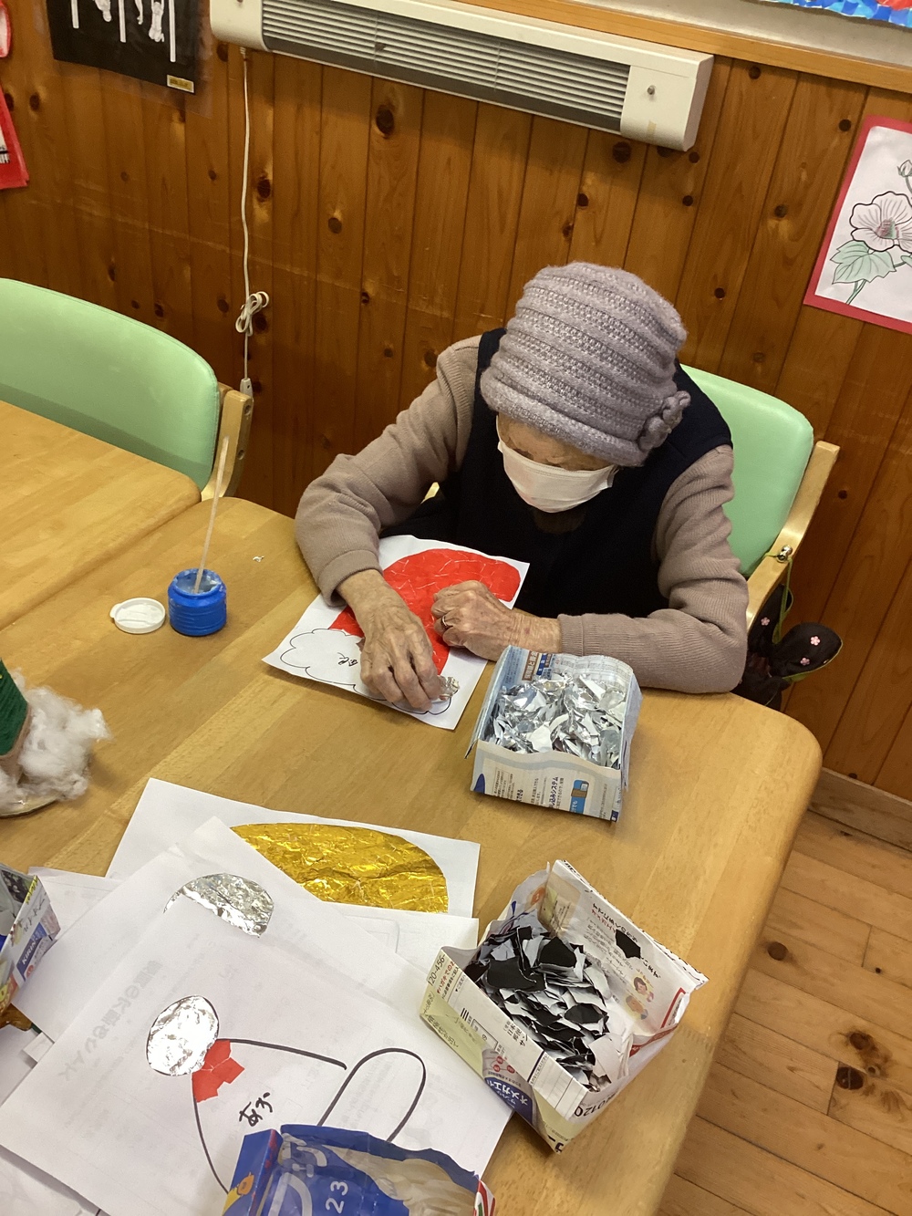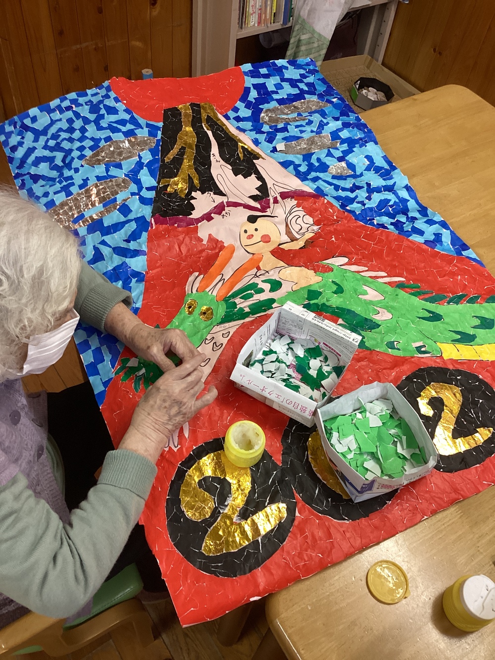 協力して(憩い) 2023年12月12日 本日は、忘年会2日目! という事で、職員による出し物を行いました! 歌謡曲の披露もあり、皆さん聞き入っておられました! 来年の干支「辰」の手芸も完成間近です! 皆さんに協力して頑張っておられます!