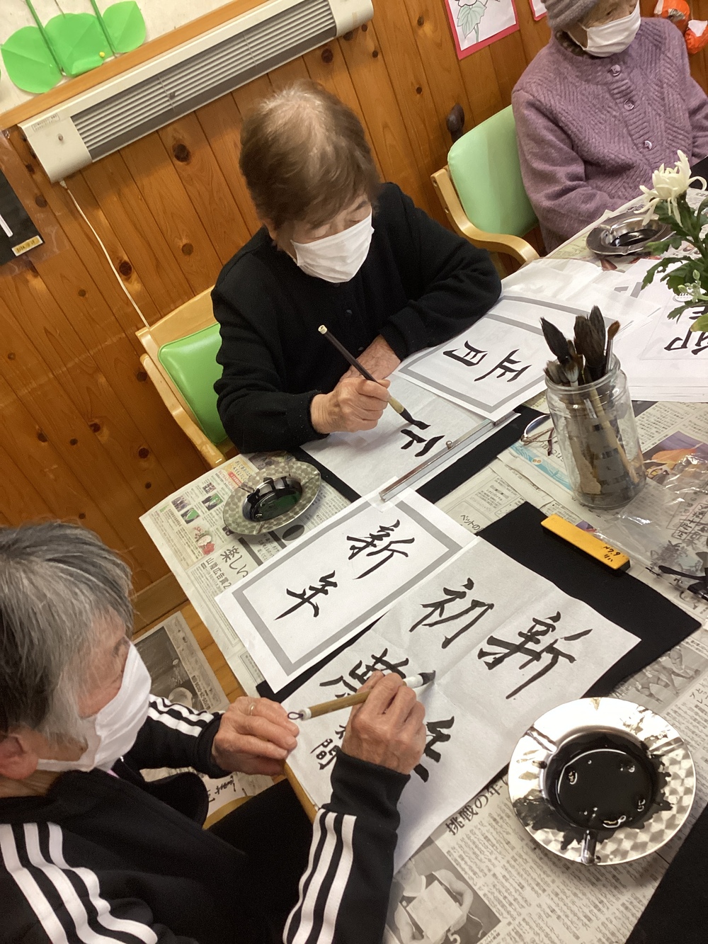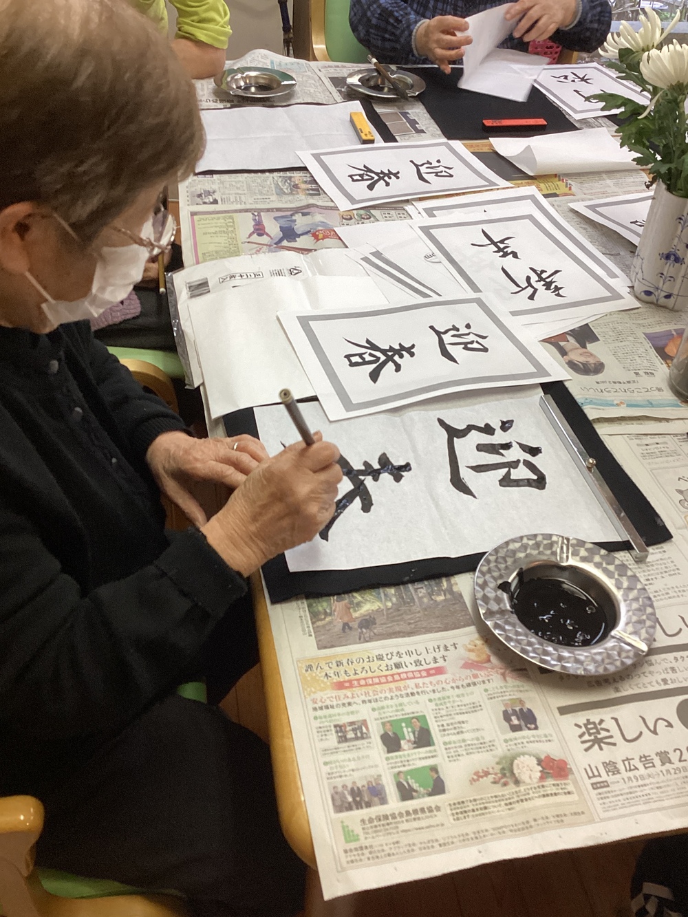 精神統一(憩い) 2024年01月06日 書き初め! 本日は、正月の恒例行事「書き初め」を行いました! 「集中して書かないけんね」と精神を統一され 書き初めに挑んでおられました! 畳体操も頑張って取り組んでおられます!