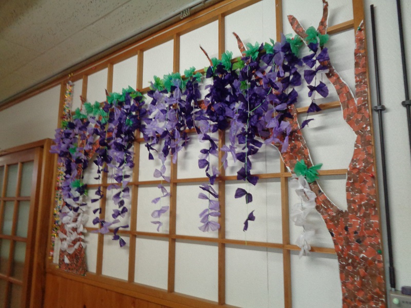 2022年05月09日 展示品ビラあさやまでは、廊下やデイルームのあちらこちらにたくさんの展示品があります。本日はその展示品を紹介したいと思います。玄関入ってすぐに見えてくるのは「藤の花」です。廊下には「鯉のぼり」や「蝶々」「ツツジ」などが飾られています。手芸の時間でたくさんの作品を作ってくださいました。「きれいだね!」と、足をとめて見ておられる方もおられました。