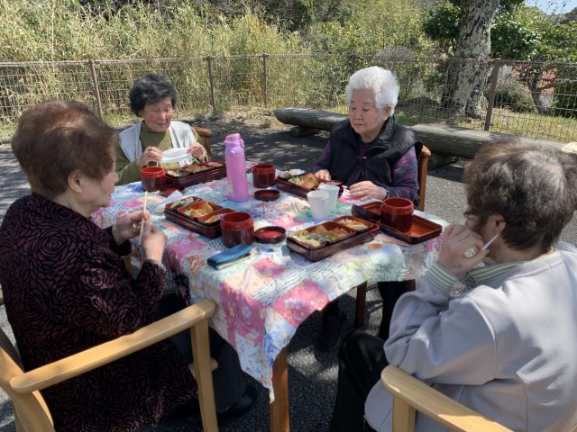 2022年04月05日 いつもより一段と今年は花が散らずに長く綺麗に咲いています。外も暖かかったので、お弁当を持ってあさやまの桜の木の下でお花見をしました!見上げると、青空とうすピンクの桜!そしておいしいお弁当!「もう言う事がないわ、最高!」「いい思い出になったよ、ありがとう」と、さくら満開、笑顔満開でした!!