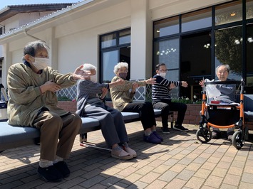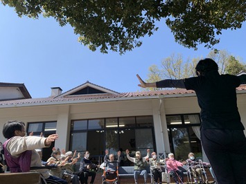 2022年04月09日 のびのび青空体操今日もいい天気で、初夏のような暑さでしたね。午後から皆さんと外に出て体操を行いました!空が高く開放感があり、いつもよりも体が伸びています!体操の後、三瓶山に届くように大きな声で今月のうたを歌いました!「気持ちがいいね」「風が吹いて涼しいね」とリフレッシュされた様子でした!