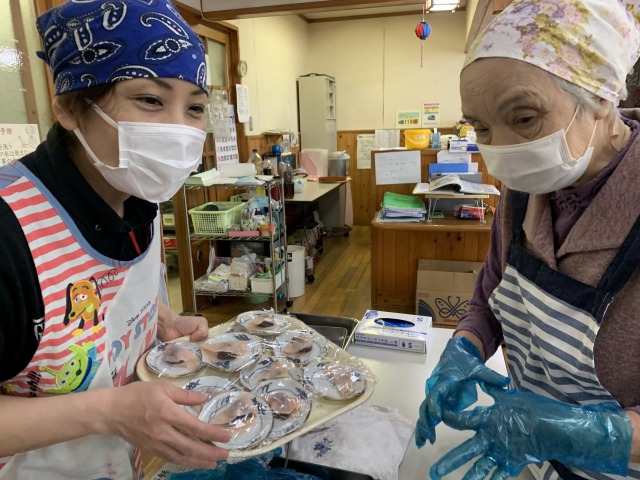 2022年04月13日 手際よく新年度が始まってから最初のクッキングです。今日は「さくらもち」を作りました!材料と手順を説明させて頂いたら、職員が手を出す事もなく、あっという間に完成です!美味しいおやつを召し上がっている写真を撮らせてもらおうとカメラを向けると、皆さん食べ終わられた後!作るのもあっという間でしたが、食べるのもあっという間のおやつの時間でした!!