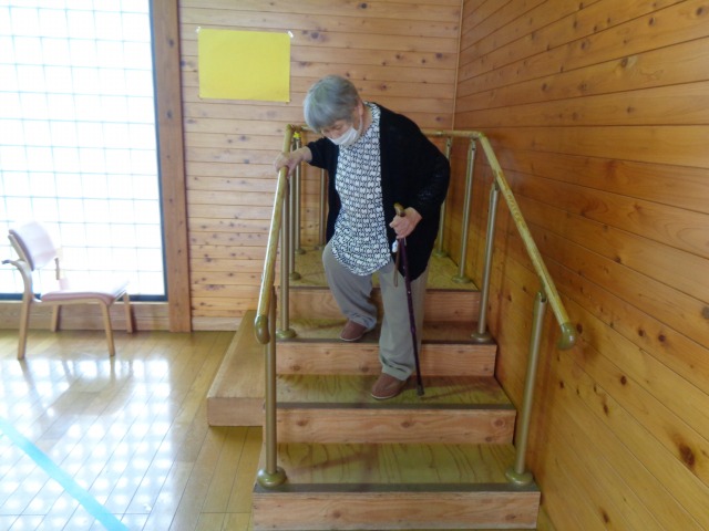 2022年04月27日 楽しみです!今日は新しいリハビリルームを初めてじっくりと体験していただきました。障害物を避けてもふらつかない様にジグザグ歩行や、歩幅を合わせて歩行したり、背筋を伸ばしたり。自宅での段差を考えて階段昇降の訓練もあります。まだまだ未完成ですが、皆さんに楽しみながらのリハビリでどんどん活用して欲しいと思っています。午後活動の時間には出入り口の看板を作品として作っていただいています。手作り感満載のリハビリルーム...完成が楽しみです。