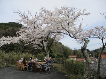 2022年04月05日 本日のお茶会!!(憩い)まだまだあさやまの桜はきれいです。過ごしやすい気温になり、今日はお花見をしながらのお茶会を開きました。歩行訓練を兼ねて駐車場まで行きました。「まだかいなぁ。」「疲れたわ。」という方もおられましたが...桜の木の下のテーブルを見て「宴会だねぇ、素敵だね。」と喜んで席につかれました。少しづつ爽やかな風が吹き、気持ちの良い午後の一時でした。