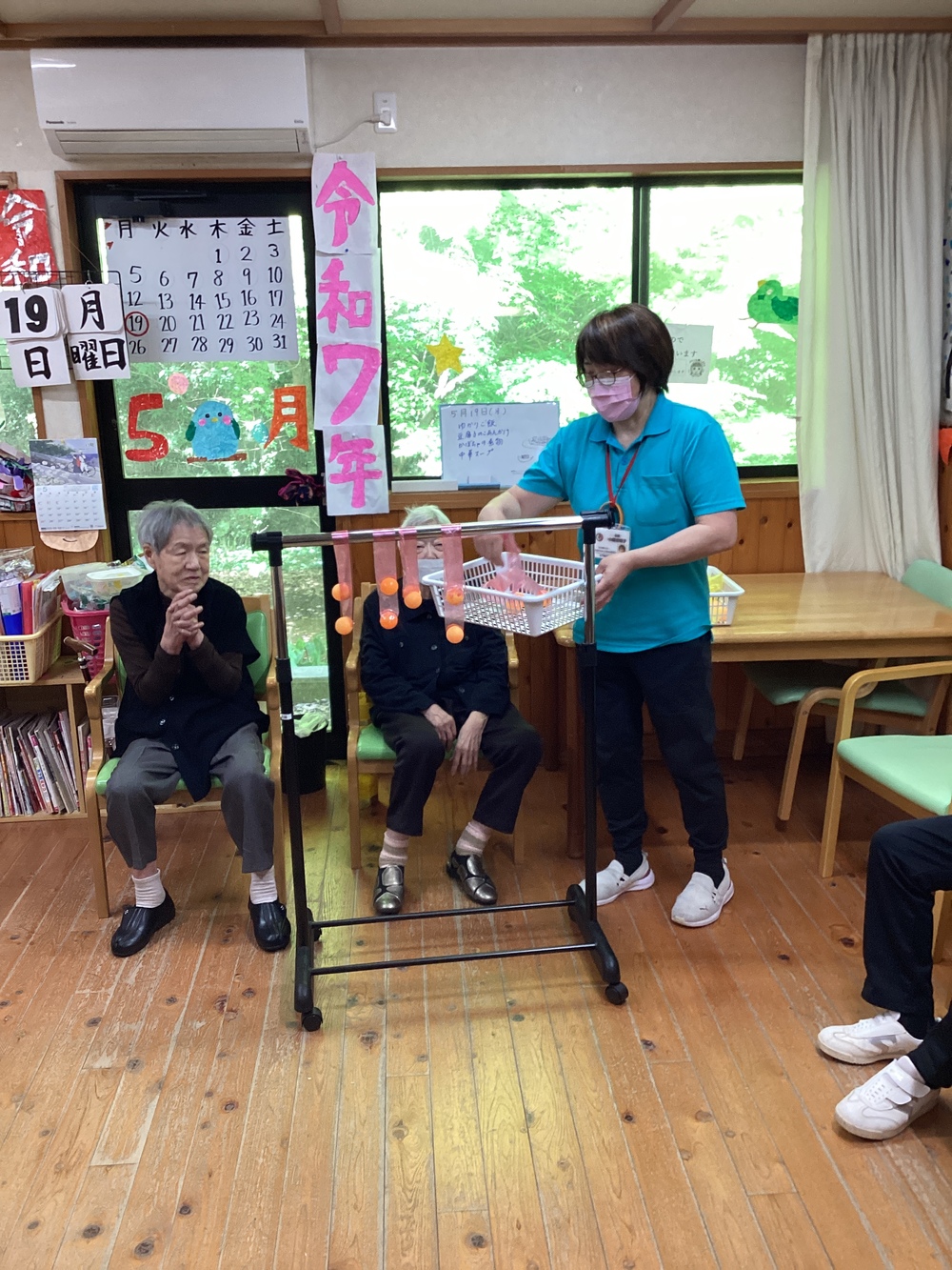 梅雨が早くなっています(憩い) 2025年05月19日 雨だれ何本?ゲーム 今年は梅雨が早そうですが、 憩いではそれよりも早く五月雨が降りました ピン球が付いた紐を棒に何本かけられるかを競いました 大雨、小雨、霧雨などいろいろな雨を降らしておられました ジメジメの梅雨は来てほしくないですね