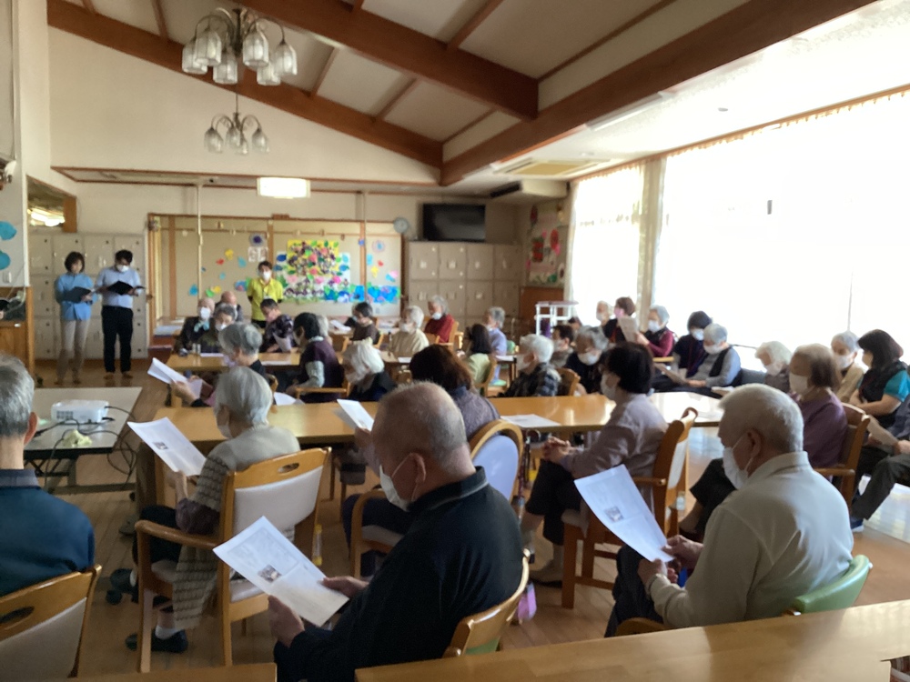 朗読を楽しむinビラあさやま 2025年06月04日 劇研 空さんがきてくださいました 昔の歌をギターに合わせ「われは海の子」や「茶摘」を皆さんと歌いました。 最後には劇研 空さん皆さんで「サヒメの大使命~海を越え石見の大地へ~」を朗読されました。 利用者さんも感動してみておられました。とてもいい経験となりました、ありがとうございました!!