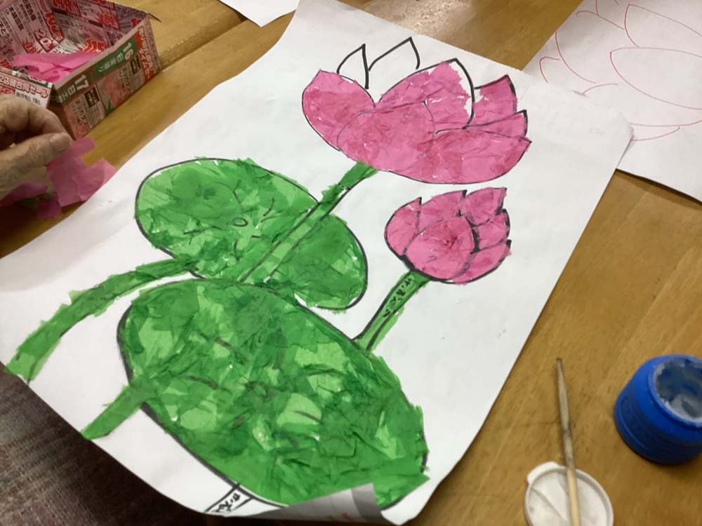 そろそろ咲く時期です(憩い) 2023年06月16日 蓮の花が咲く時期になってきました。 みなさんで蓮の花のちぎり絵をしました。 折り紙を使用せず、お花紙を使用しました。 折り紙と違って紙の厚さが薄く、貼る時に破れやすい為慎重に貼っていました。