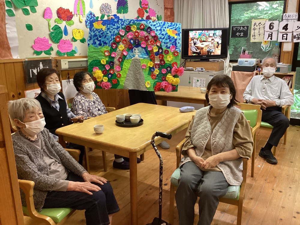 梅雨に向けて(憩い) 2024年06月04日 季節感バッチリ 季節に応じてちぎり絵の題材を決めて作ります 梅雨にちなんだものを作って頂きました 昨日までに出来上がったローズガーデンの前で写真撮影をしました おしとやかに生け花 生け花でデイサービスは華やかになります