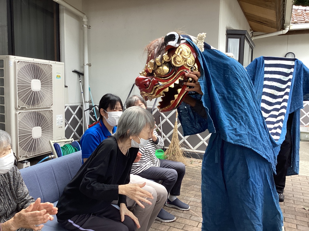秋だ!祭りだ! 2024年10月14日 朝倉神社秋祭り ビラあさやま近くの神社で秋祭りがありました 玄関の長椅子に座り、山の祠にお参りされる雄姿をみました 待っている間、ビラあさやまの獅子舞が登場し、 皆さんの健康を祈って頭をかみました そして、本家本元の天狗と獅子舞が来てくださいました 皆さん、獅子舞に頭を差し出し、噛んでもらっていました みなさんとても喜んでおられました みなさんとビラあさやまに、ご利益がありますように
