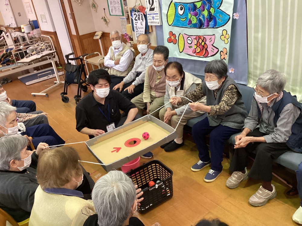 お茶会をしました! 2025年06月02日 本日のゲームはボール落としです! これがなかなか入らないのですが、2人で息を合わせながら頑張られました!! 本日の一位は何と26秒‼ とっても早かったです‼ 楽しんだ後は、お茶会を行いました! 皆さんから「美味しい」と大好評でした!
