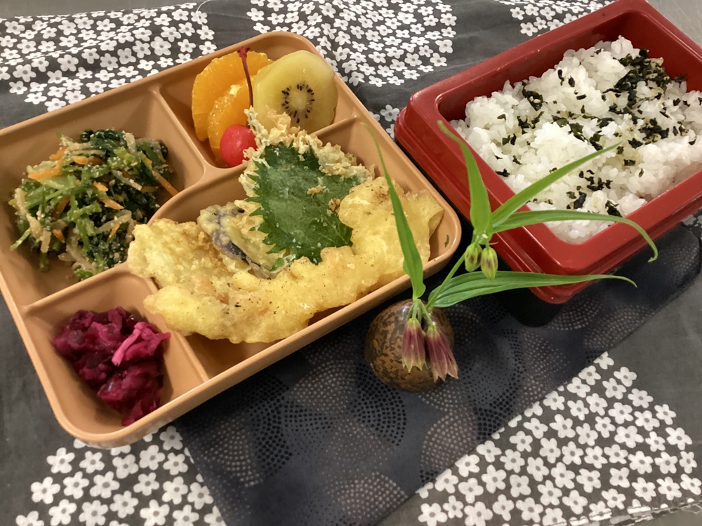 まき団子作り第二弾&本日のお弁当 2025年06月21日 本日、二回目のまき団子作りを行いました。 まず、まきの葉に油を薄く塗ってもらいました。 あんこを生地で包み、まきの葉で包んでいきます。昔はよく作ったけど・・・初物だわ!楽しみだわ♪ 熱々を食べて頂きました。柔らかくて美味しいと大好評でした。 本日のお弁当は皆さん、大好物の天ぷらでした。!