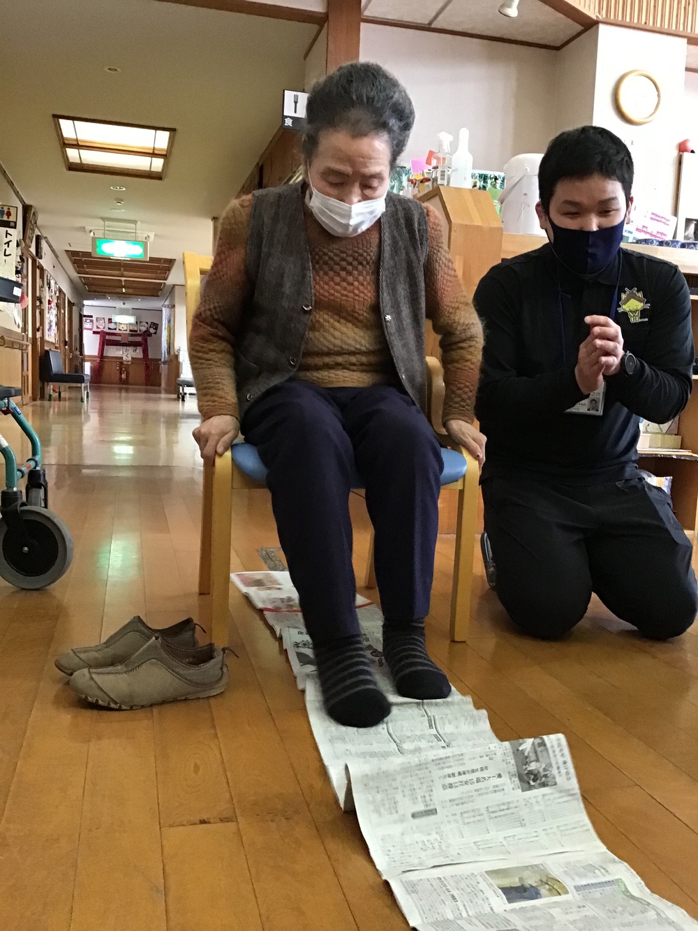 今週のゲームは、足の機能維持を目標に新聞綱引きを行いました。