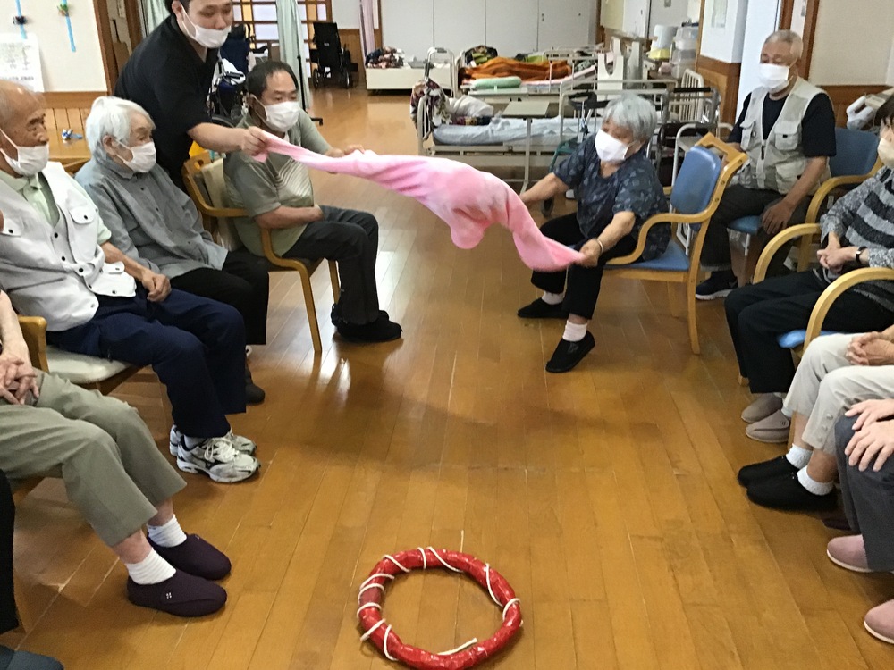 息を合わせて 2024年08月12日 今週のゲームは、2人で息を合わせておじゃみを輪っかに入れ個数を競います。 「せーの!!」「いちにーの!!」と掛け声が響き渡ります♪ 応援も一生懸命です!! 本日の優勝ペアです。合計で17個入りました。 今週もしっかりと体を動かし、楽しみましょう♪