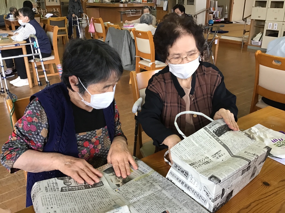 秋空 2024年10月10日 本日も『せせらぎのこみち』へ探索に出掛けました。 天気もよくて、気持ちいいね!と秋空の下で記念撮影です♪ 手先が器用なA様に新聞紙エコバッグの作り方を教えてもらいました。 新聞紙のエコバッグに興味津々の様子でした♪